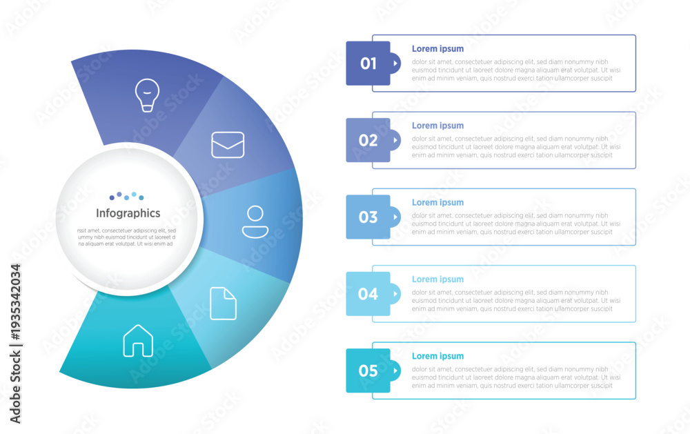 Naklejka na ściany i meble - 5-circle infographics are versatile visuals using five interconnected or segmented circles to represent processes, data shares, or concepts like business cycles..