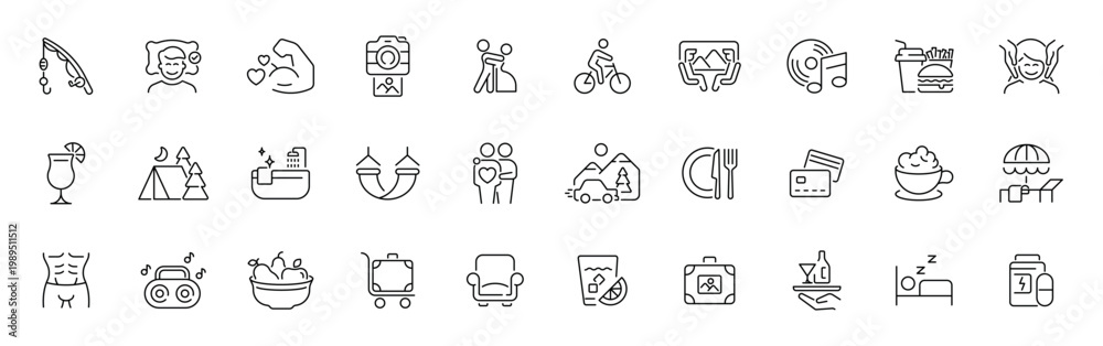 Naklejka na ściany i meble - Lifestyle line icons set with thin line style. editable stroke for leisure, travel, and relaxation concepts.