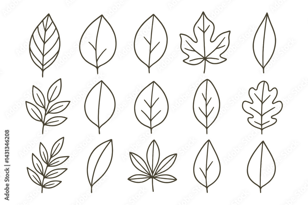 Naklejka na ściany i meble - Detailed collection of leaf icons suitable for nature-themed projects and designs with clean outlines.