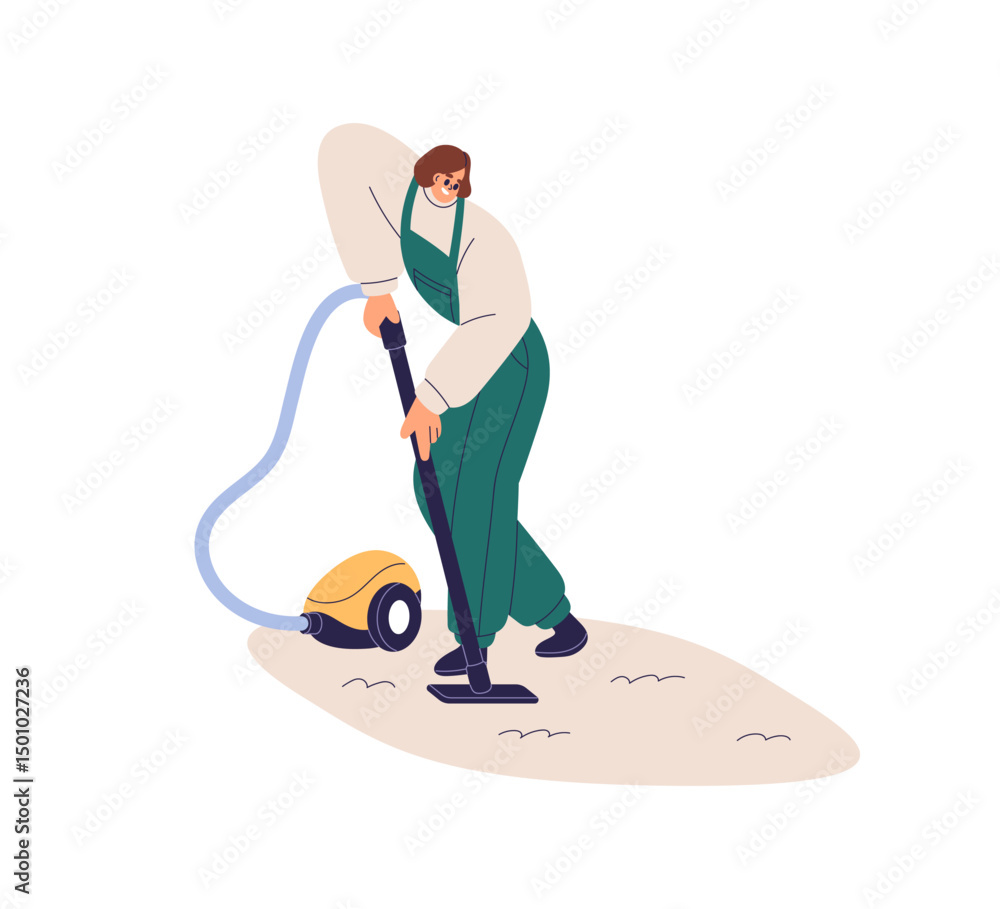 Naklejka na ściany i meble - Housework with vacuum cleaner. Woman from cleaning service, doing cleanup, housekeeping work with appliance for clean carpet, rug, floor mat. Flat vector illustration isolated on white background.