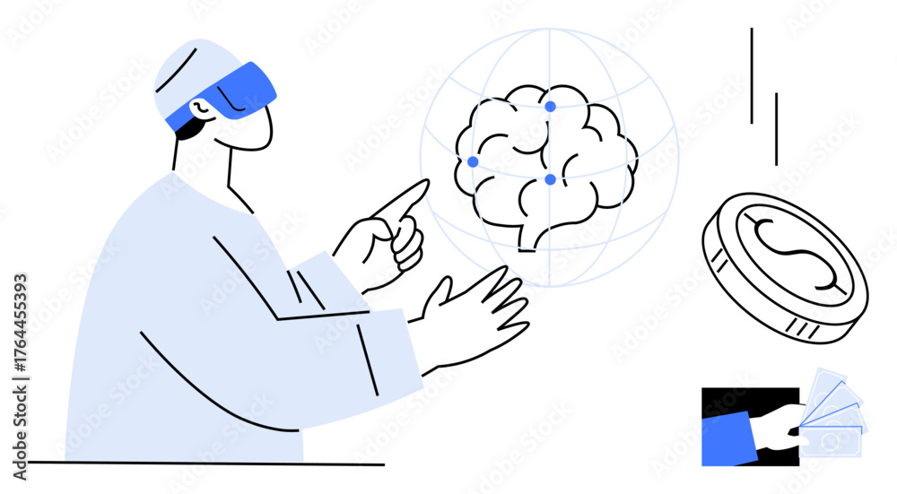 Naklejka na ściany i meble - Person wearing VR headset interacting with a brain diagram, digital coins, and financial data. Ideal for technology, innovation, neuroscience, virtual reality, data analysis, finance education.