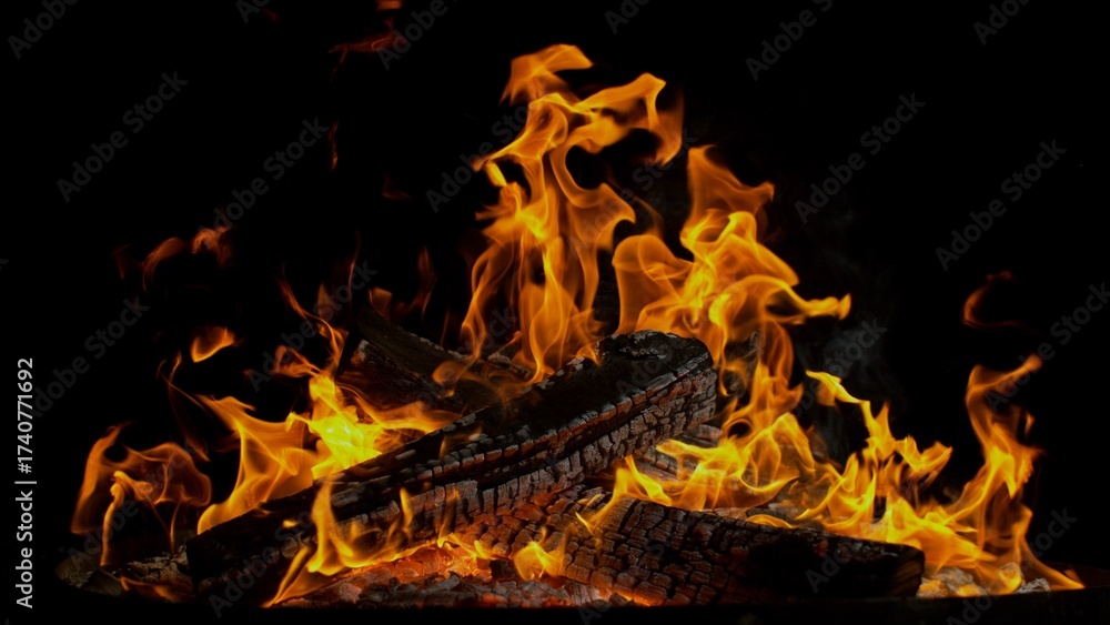 Naklejka na ściany i meble - Detail Shot of Campfire , Glowing Logs , Isolated on Black Background.