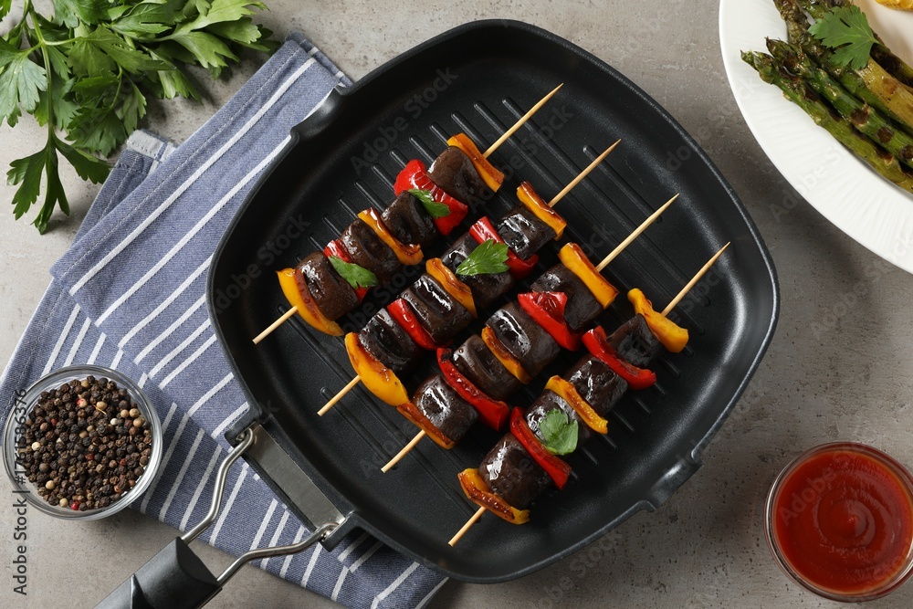 Naklejka na ściany i meble - Skewers with tasty grilled vegetables served on grey table, flat lay.