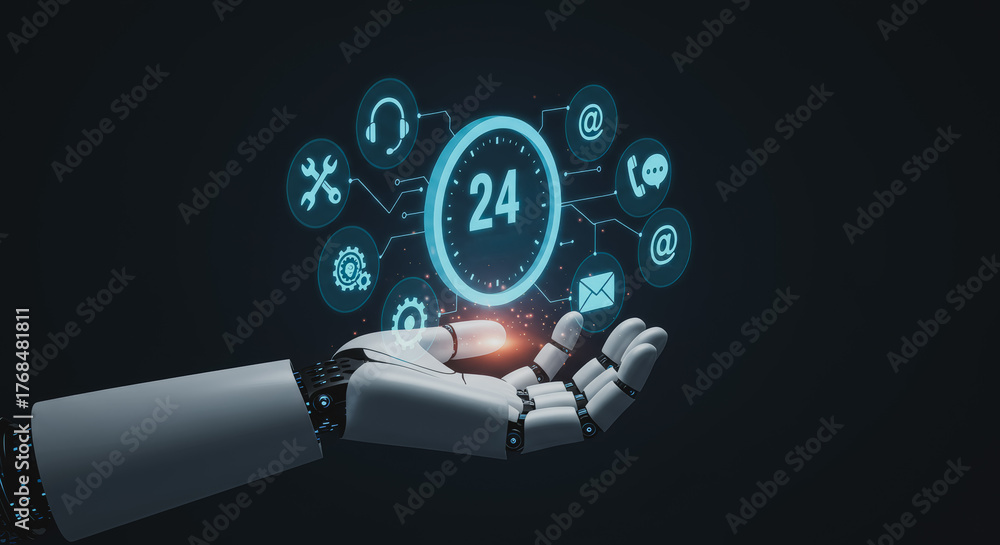 Naklejka na ściany i meble - An AI robot arm cradles a digital interface, symbolizing 24/7 support and technological assistance. A striking digital representation of modern customer service, innovation, and technological support..