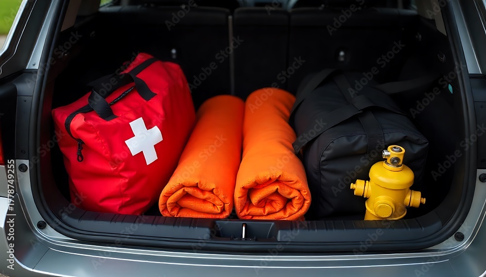 Naklejka na ściany i meble - A car trunk filled with various emergency supplies, including a red first aid kit with a white cross, orange blankets, Emergency car kit with blanket and tools in vehicle, created with generative ai.