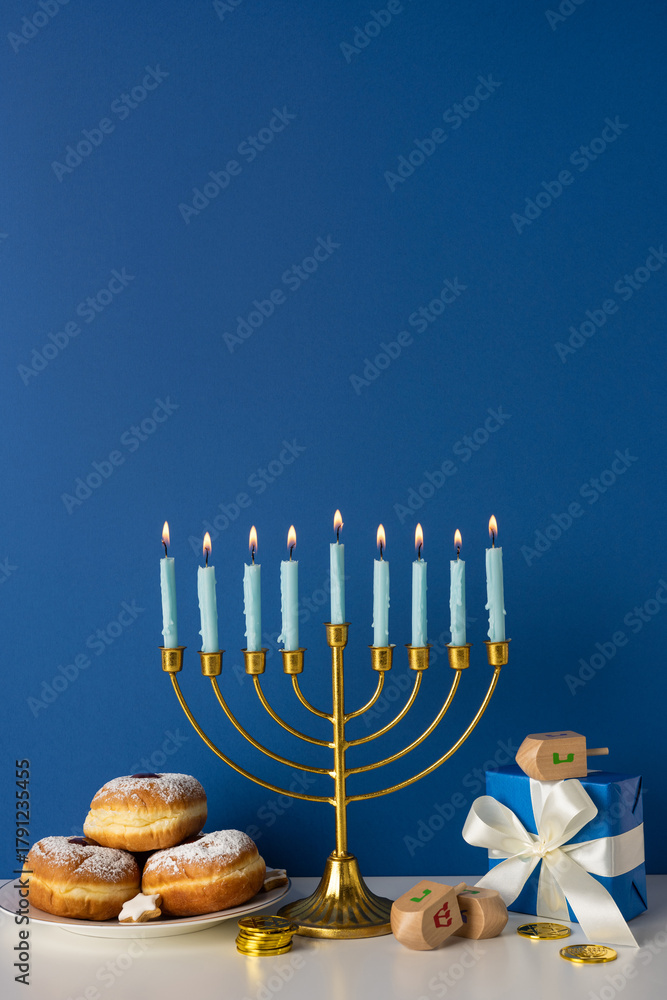 Naklejka na ściany i meble - A vertical festive Hanukkah scene with a lit menorah, soft candle glow, donuts and coins, and wrapped gifts on a blue backdrop. Warm, celebratory mood suitable for holiday greetings.