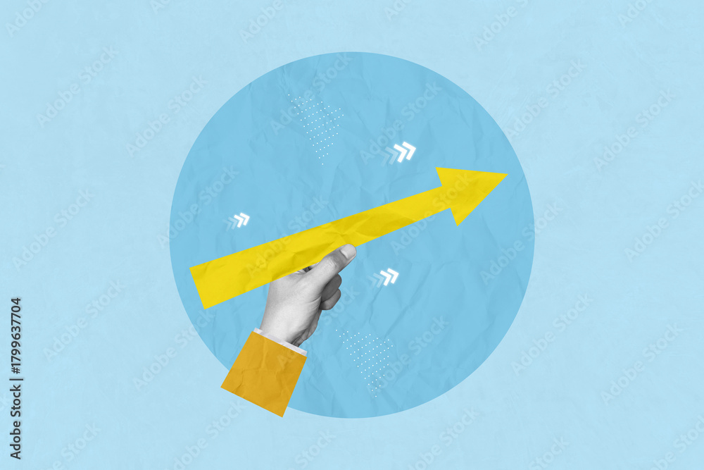 Naklejka na ściany i meble - Creative art collage of man hold carry yellow arrow development path direction success statistics growth aim achievement.