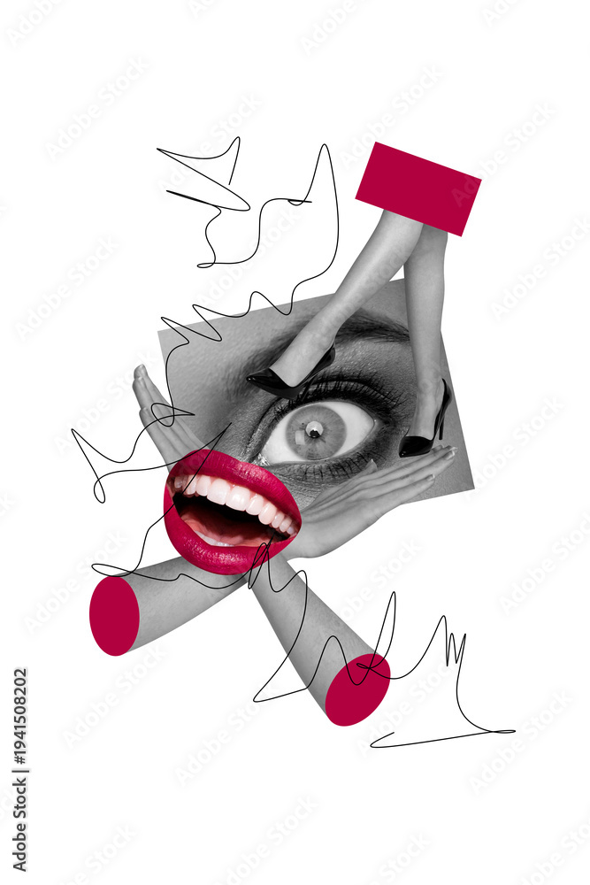 Naklejka na ściany i meble - Vertical photo collage of happy mouth smile hands show cross stop gesture legs cutout body part surgery isolated on painted background.