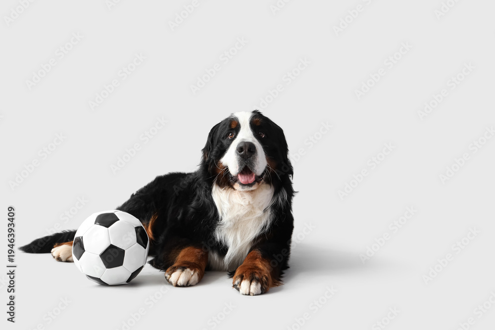 Naklejka na ściany i meble - Cute Bernese mountain dog with soccer ball lying on light background.