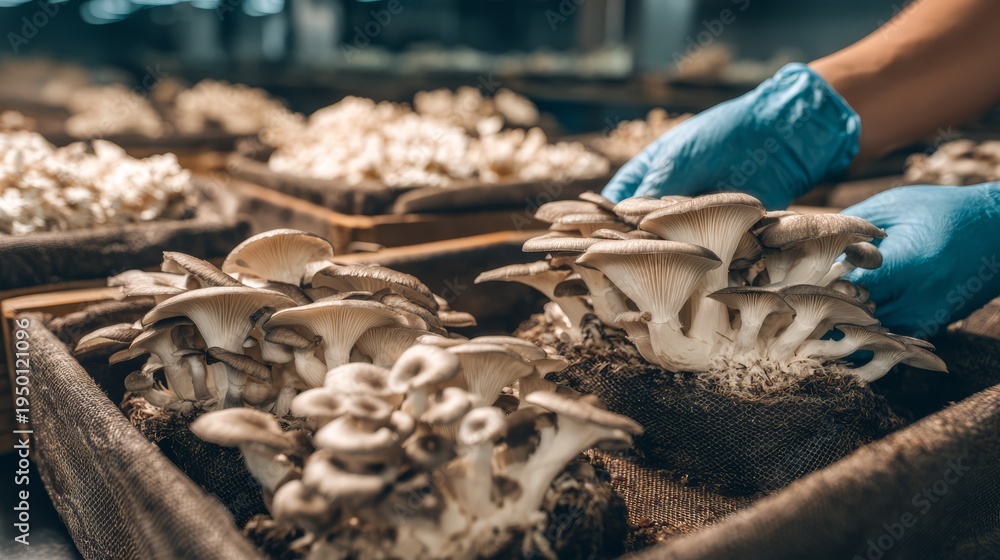 Naklejka na ściany i meble - A mushroom farmer harvesting oyster mushrooms growing in climate controlled cultivation bags. Concept of pleurotus mushroom cultivation..