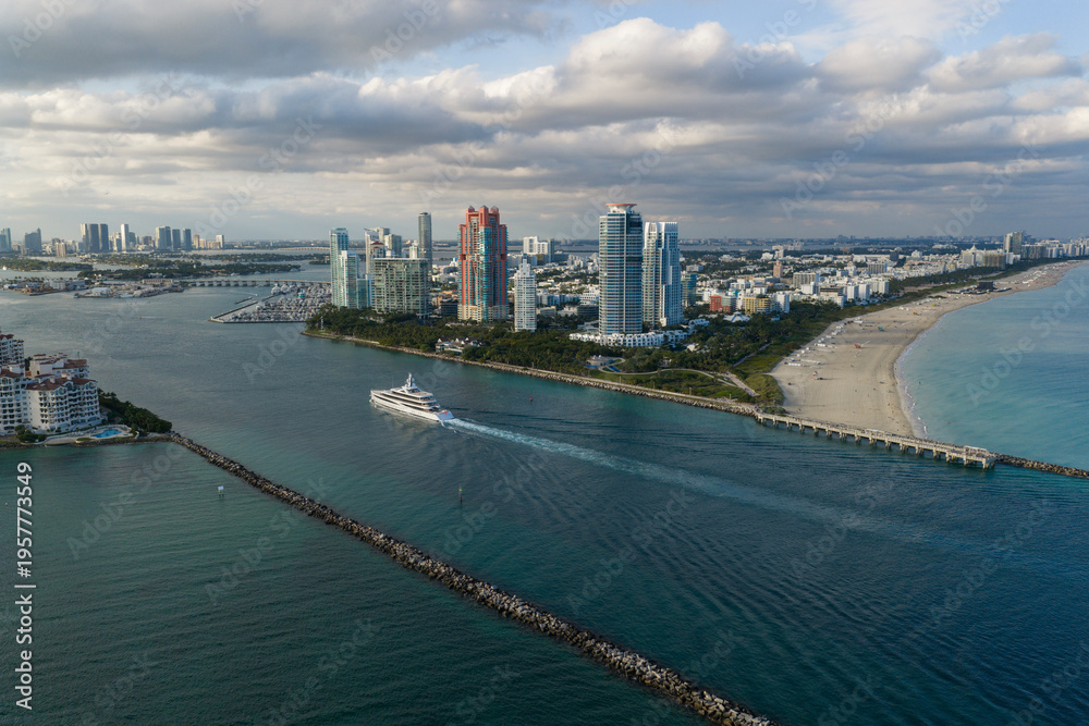 >Naklejki na ściany i meble>Wybrane motywy - zobacz więcej !>Góry>Miami south beach view. Yacht boat tour. Luxury boat yachting. Luxury yacht in sea. Aerial view motorboat. Luxury lifestyle. Vacation on summer. Yacht at sea. Motorboat aerial top view