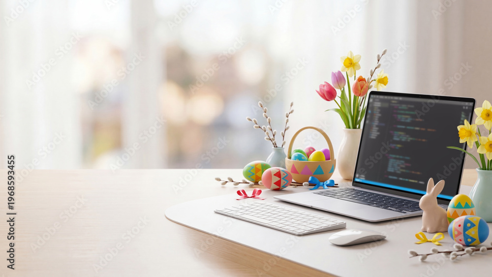 Naklejka na ściany i meble - Easter decorations on modern office desk with open laptop. Colorful eggs, bunny figurine and spring flowers like tulips and pussy willows. Holiday workspace concept blending productivity and festive.