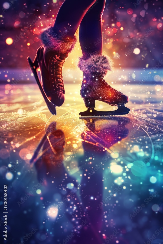 Naklejka na ściany i meble - Ice skater performs vibrant figure skating show under neon lights, with energetic and dynamic performances at night.