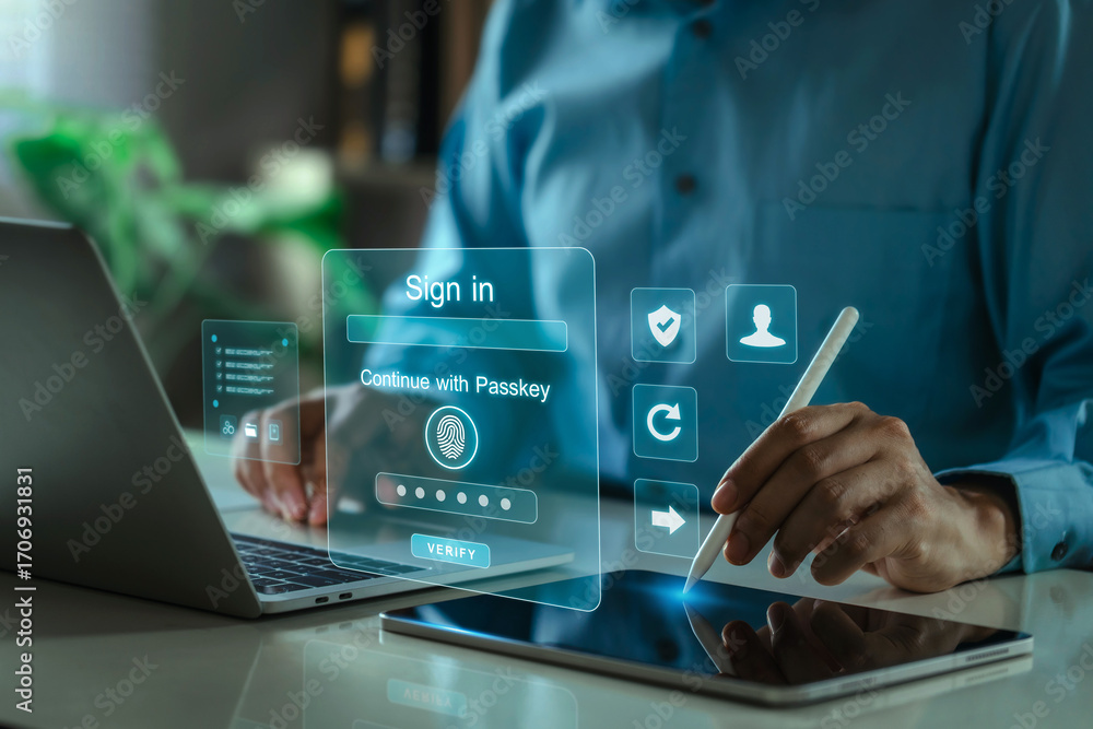 Naklejka na ściany i meble - Passwordless login with passkeys and biometric fingerprint authentication on tablet and laptop, illustrating cybersecurity, MFA, and identity protection. Ideal for Cybersecurity Awareness Month..