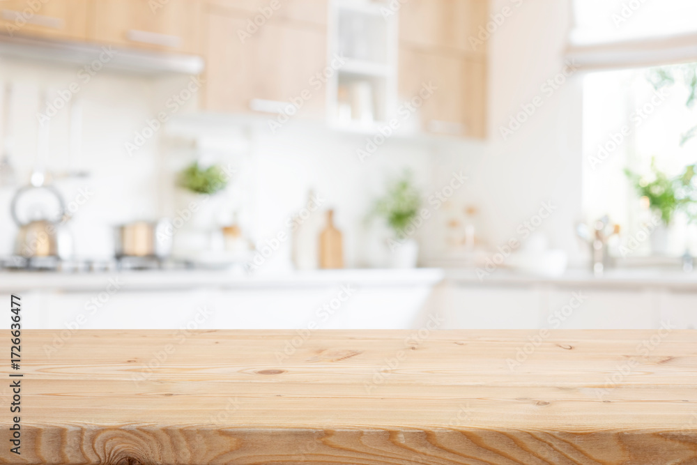 Naklejka na ściany i meble - Empty wooden table for food presentation with bright blurred kitchen interior background.