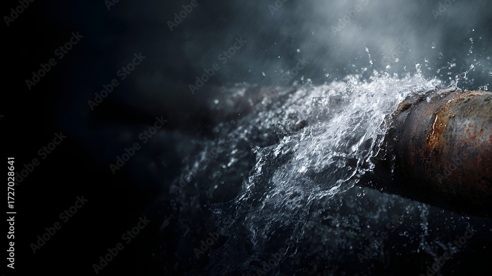 Naklejka na ściany i meble - A rusty pipe bursts spraying water in a dramatic urgent scene highlighting a plumbing emergency and potential damage.