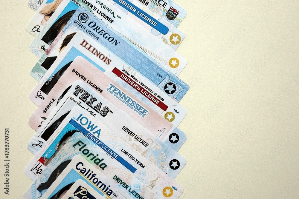Naklejka na ściany i meble - Big amount of driving licenses from various USA states. Stack of driving license specimen cards.