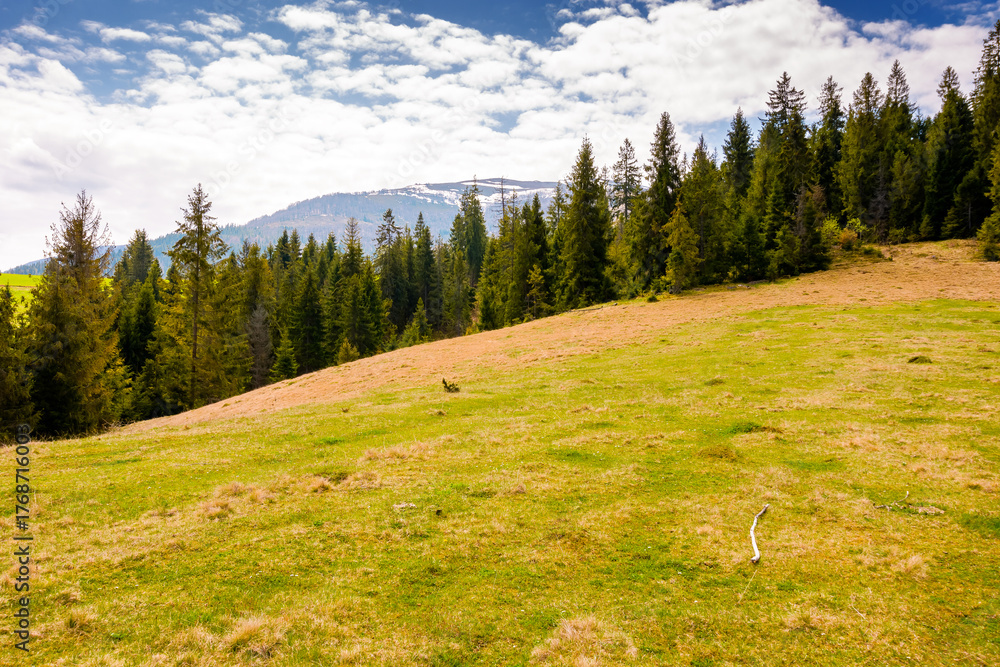 Naklejka na ściany i meble - mountain landscape with spruce forest in spring. green meadow on the hill on a sunny day. distant carpathian range with peaks in snow under sky with clouds. beautiful countryside scenery of ukraine.