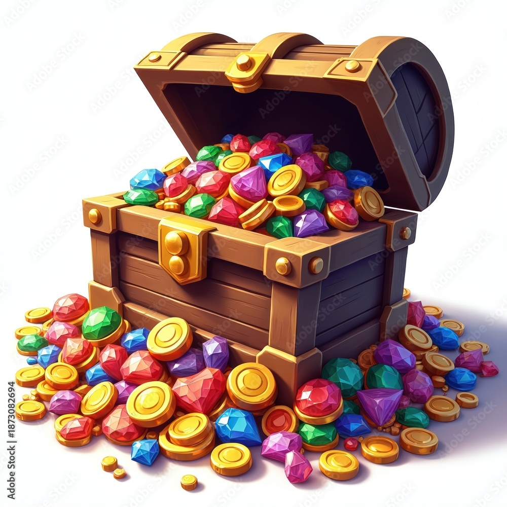 Naklejka na ściany i meble - Open treasure chest filled with gold coins, colorful gems. Antique wooden trunk with riches. Decoration element. Great for game design, financial concepts, decorative projects. Cartoon illustration.