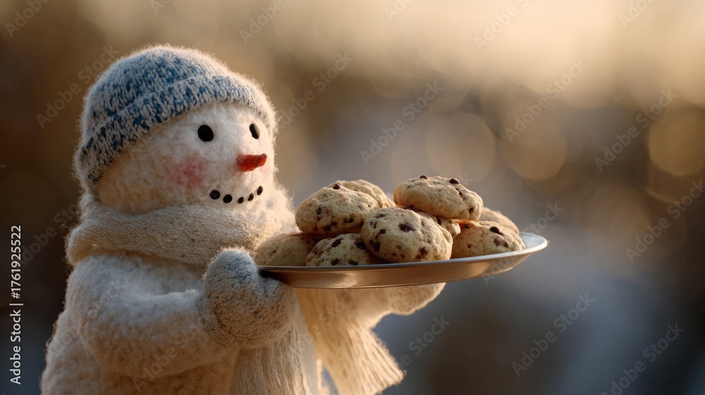 Naklejka na ściany i meble - Cozy snowman in winter woolens presents chocolate chip cookies, evoking Hygge spirit and whimsical Yulee tidings.