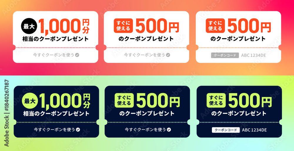 Naklejka na ściany i meble - 鮮やかなネオンオレンジと濃紺の2色で展開された、最大1000円分・500円分の割引金額が入った切り取り線付きクーポンバナー6点セット、フードデリバリーやECサイト販促に使えるベクターイラスト.