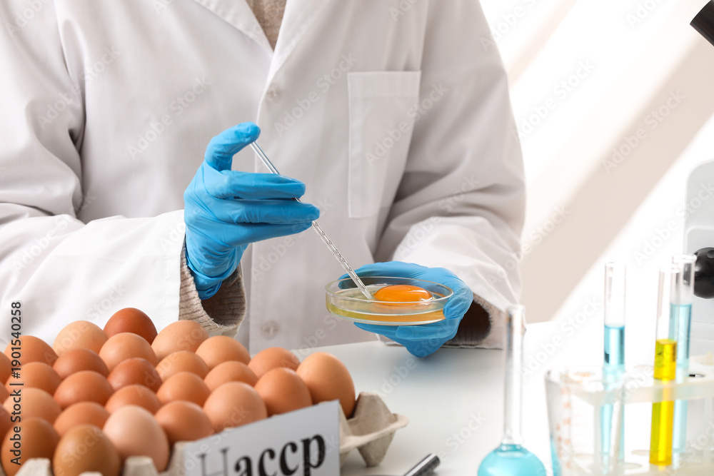Naklejka na ściany i meble - Scientist testing eggs in laboratory. HACCP concept.