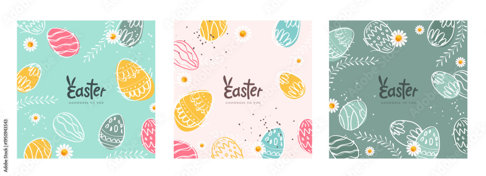 Naklejka na ściany i meble - Set of Happy easter banner background with typography Cute hand drawn easter eggs spring time nature, fun easter decoration. Horizontal poster, greeting card..