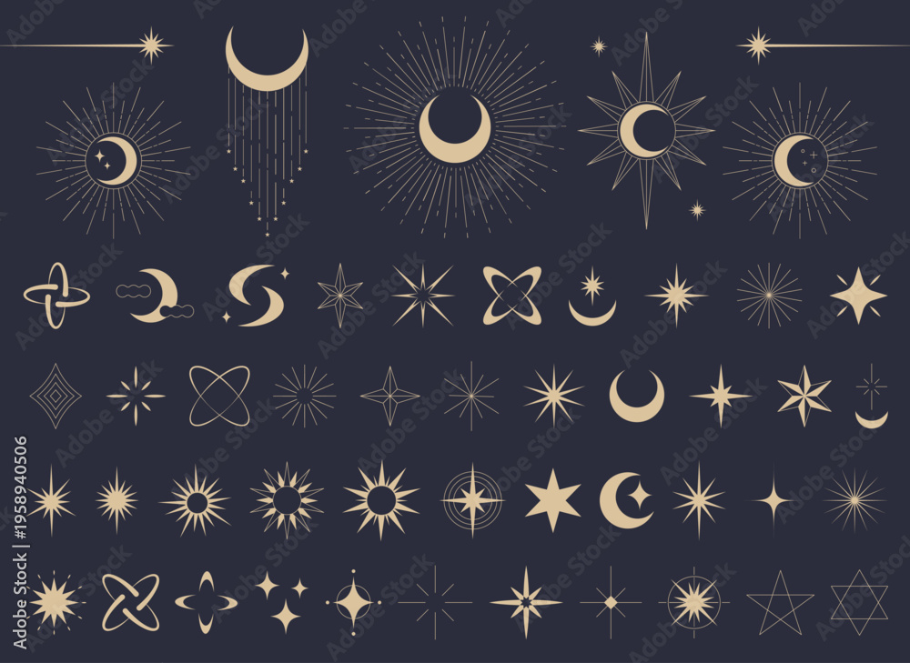 Naklejka na ściany i meble - 神秘的な月と星のアイコンセット、占星術やタロット風のエスニックなミスティカルベクターイラスト.