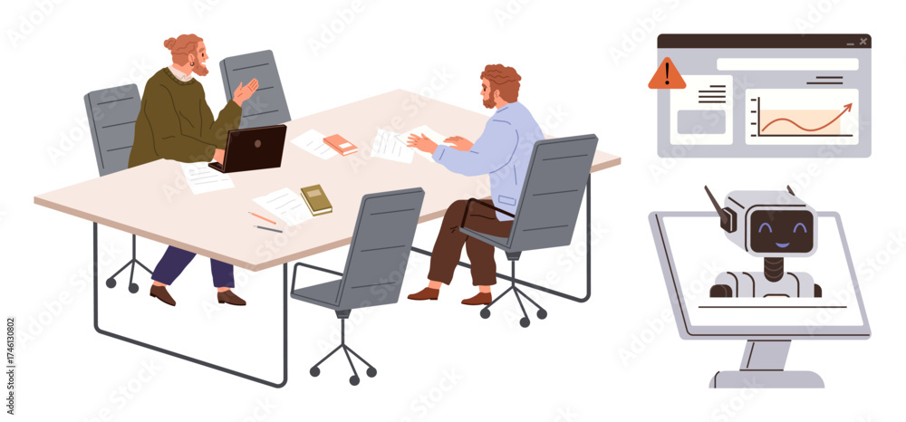 Naklejka na ściany i meble - Two colleagues in discussion around a table with papers, laptop, and books nearby a robot display and analytics chart alert. Ideal for teamwork, innovation, tech integration, and problem-solving.