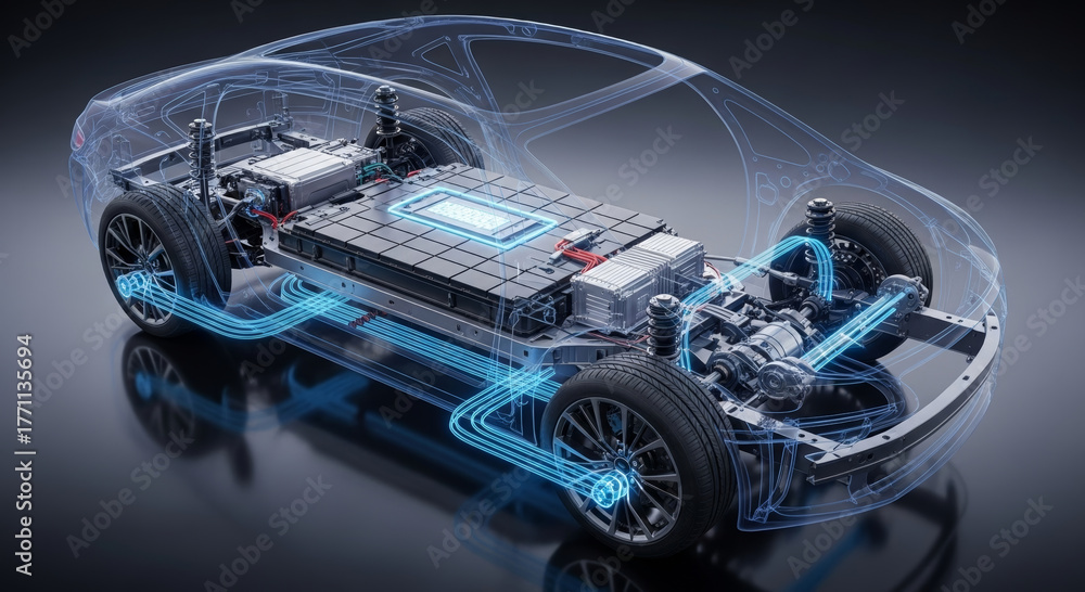 Naklejka na ściany i meble - Electric vehicle battery pack and powertrain assembly illustrating renewable energy capacity and efficient electric propulsion with transparent car body showing wiring motor suspension.