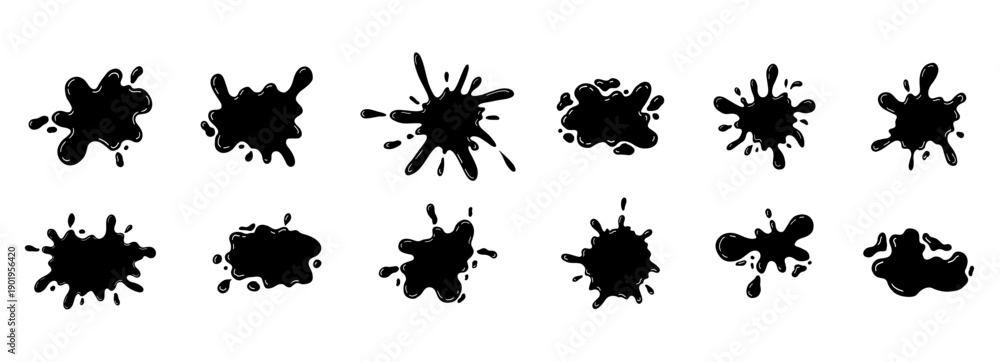 Naklejka na ściany i meble - Black smooth ink shiny blob form set. Splash with glossy drops, round abstract shapes silhouette liquid. Soft fluid organic puddle border, frame. Current drops. Ink Paint fall down liquid..