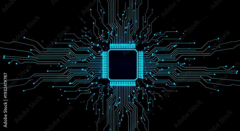 Naklejka na ściany i meble - Futuristic blue glowing electronic circuit board lines converging on central square microchip processor on black background for modern technology design concept.