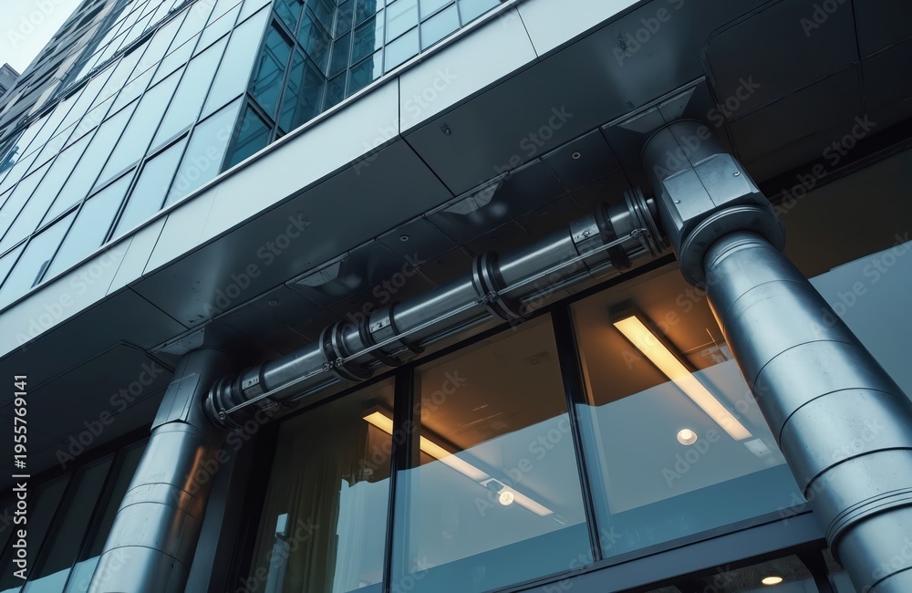 Naklejka na ściany i meble - Building foundation seismic control system. Metallic cylinders on modern skyscraper exterior. Dampers absorb vibration protecting structure from earthquake damage..