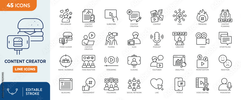 Naklejka na ściany i meble - Content creator line editable icon set. featuring icons of various media, content, podcast, blogger, live streaming, social network, and more. Editable stroke. Vector illustration .
