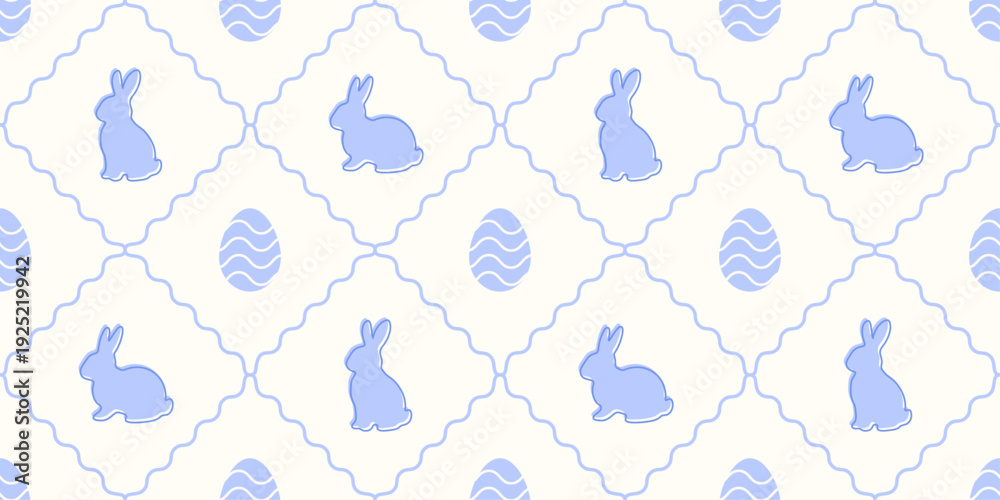 Naklejka na ściany i meble - Happy Easter Seamless Pattern with Bunny and Eggs. Cute blue rhombus lace background. Gift wrapping paper for holidays. Wallpaper with simple flat rabbits. Vector illustration.