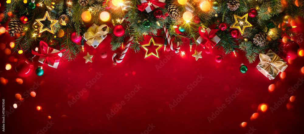 Naklejka na ściany i meble - Christmas Red - Fir Branches With Ball And Glittering Lights In Winter Background - Decorations For Holiday.