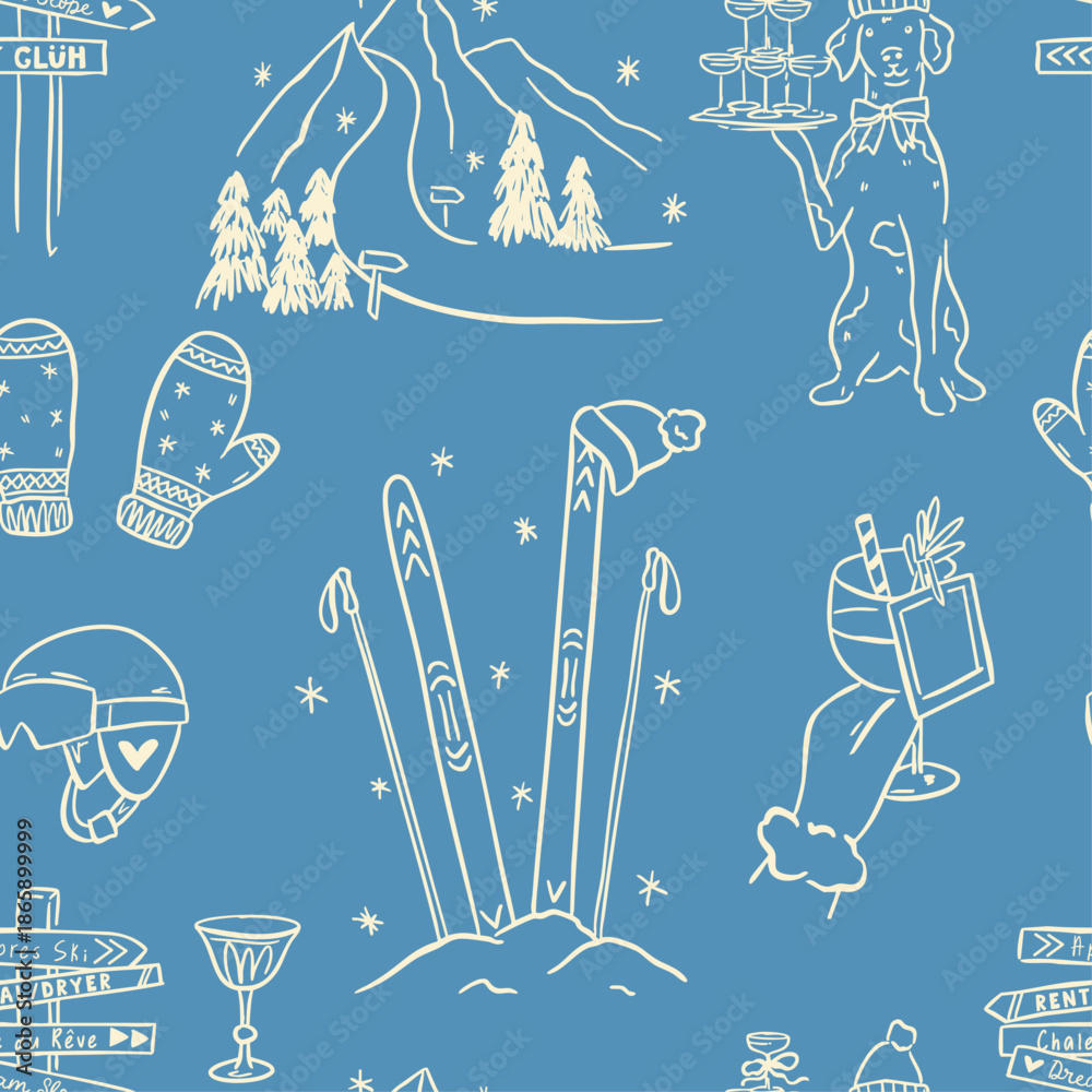Naklejka na ściany i meble - Hand drawn winter ski and apres ski seamless pattern in whimsical doodle style. Includes skiers, snowboard, clothing, equipment, cocktails and holiday elements. Cute line art, vintage background.