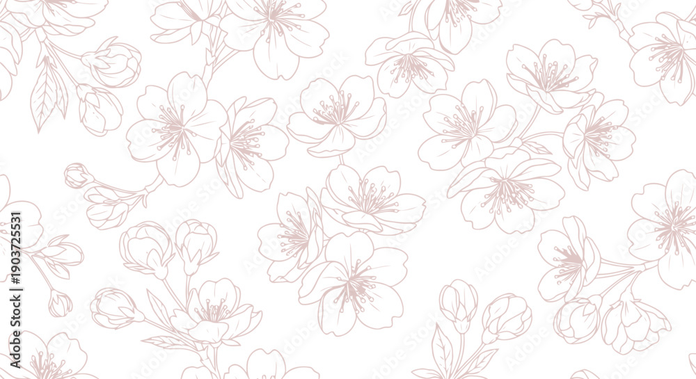 Naklejka na ściany i meble - Seamless cherry blossom floral vector clipart pattern in pastel pink line art style.