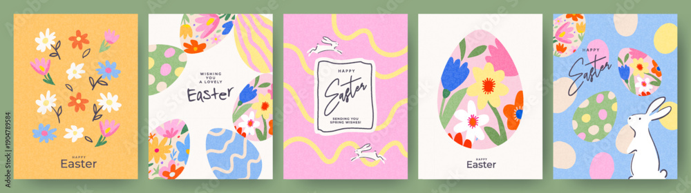 Naklejka na ściany i meble - Happy Easter set of greeting cards, posters, holiday covers. Trendy design templates with typography, hand drawn Easter eggs and bunny, spring flowers, polka dots and stripes in pastel colors..