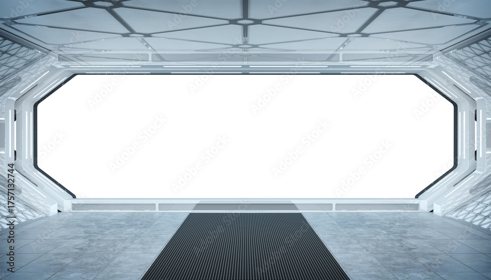 Naklejka na ściany i meble - Futuristic bright starship with glowing lights. 3D rendering. White spaceship interior with isolated cut out transparent window.