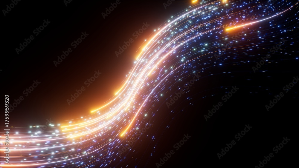 Naklejka na ściany i meble - 3d render. Abstract wavy neon lines and bokeh lights isolated on black background. Speed of light, energetic stream. Fantastic wallpaper.