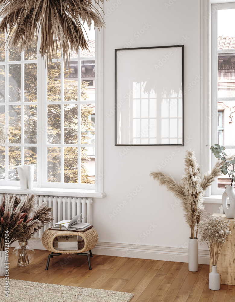 Naklejka na ściany i meble - Canvas frame mockup in floral room, botanical design, 3d render.
