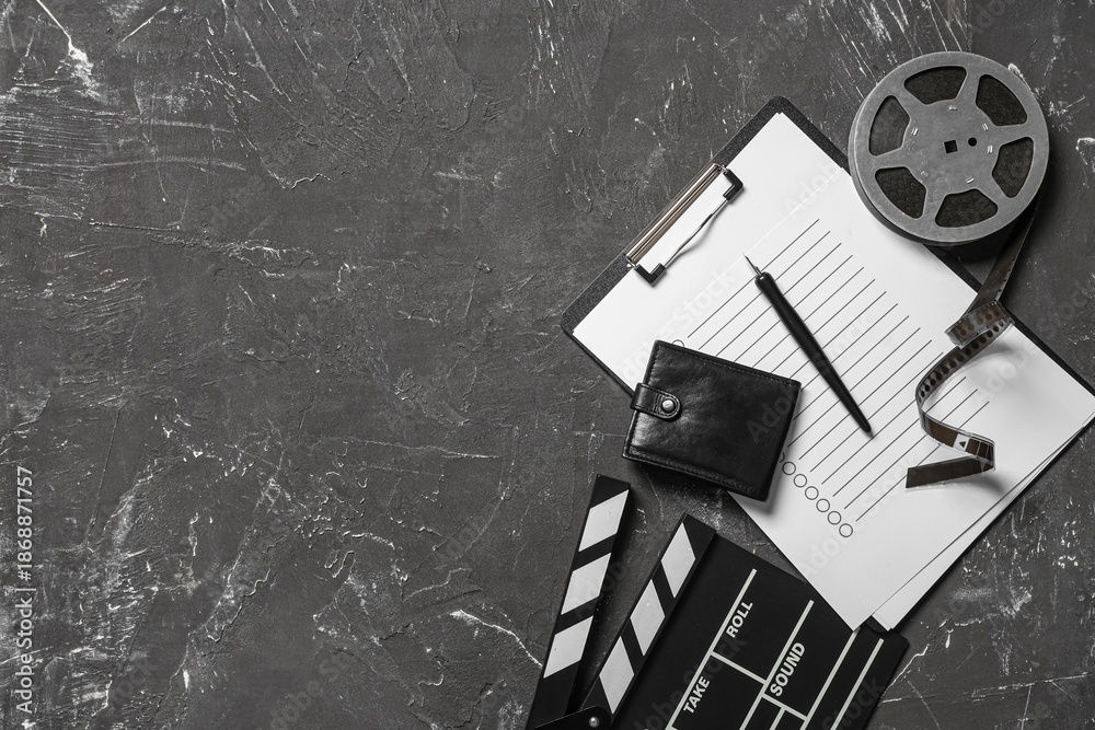 Naklejka na ściany i meble - Wallet with movie clapper, film reel and clipboard on dark background.