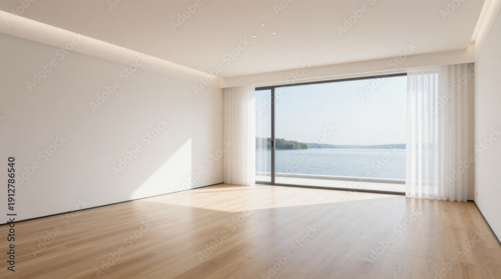 Naklejka na ściany i meble - Bright Empty Modern Interior with Panoramic Window View of Lake, Hardwood Flooring and White Walls.