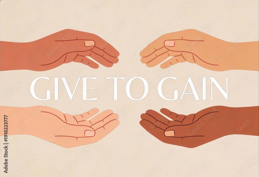 Naklejka na ściany i meble - Give to Gain theme for International Womens Day 2026. Diverse hands reaching together in a gesture of support and reciprocity.