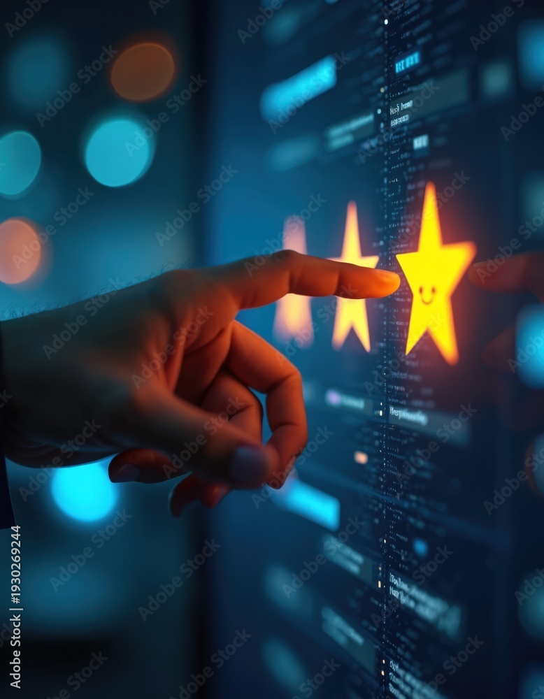 Naklejka na ściany i meble - Hand presses star rating on digital screen. Person gives feedback with glowing five star, app interface for customer satisfaction review. Online survey..
