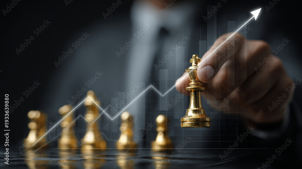 Naklejka na ściany i meble - Business strategy growth success golden chess king upward arrow leadership planning finance concept success investment motivation.