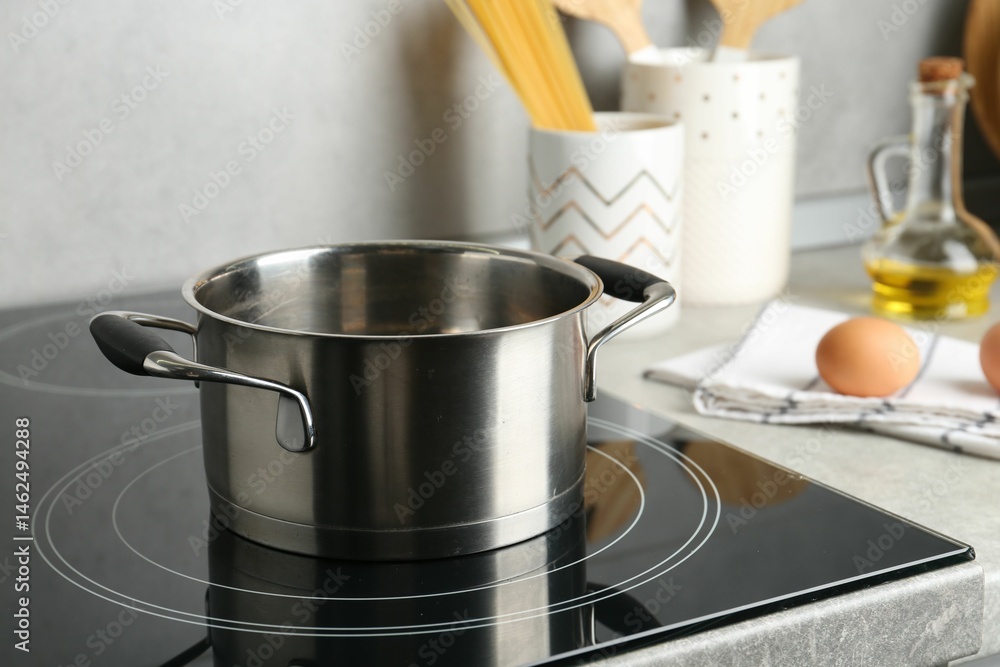 Naklejka na ściany i meble - Cooking pot on cooktop indoors. Kitchen utensil.