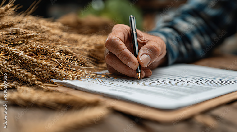 Naklejka na ściany i meble - rural agriculture protection crop insurance policy contract signing with farmer pen tools paperwork harvest risk coverage legal security finance business support document.
