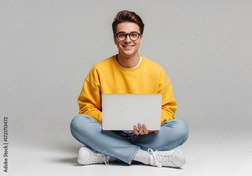 Naklejka na ściany i meble - Young man with glasses wearing a yellow sweatshirt and blue jeans, sitting crosslegged with a laptop of mockup.